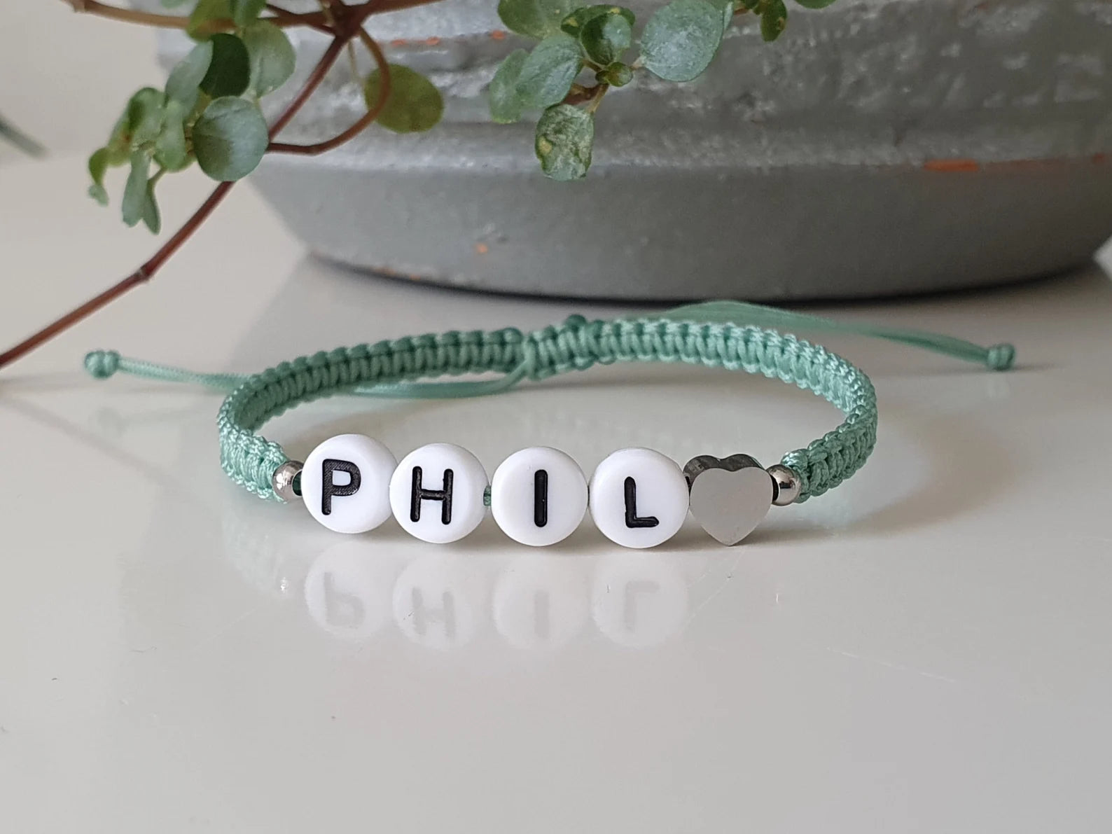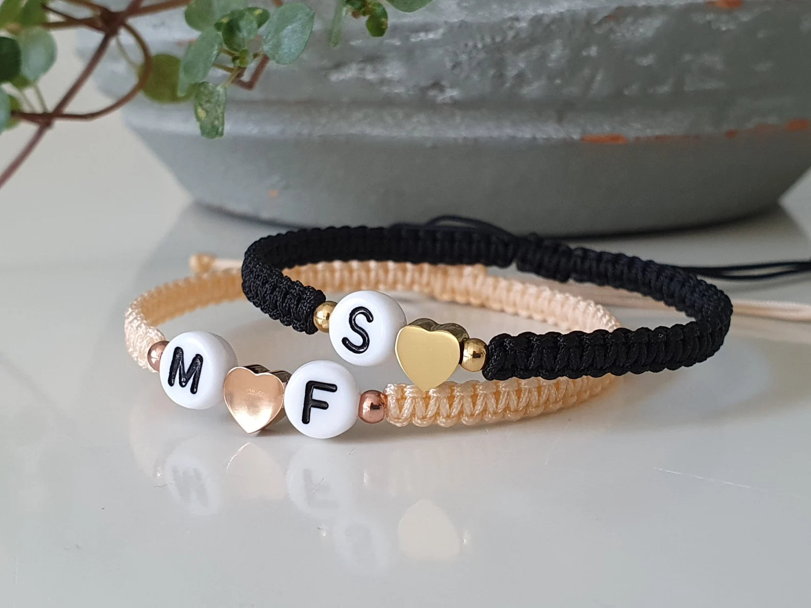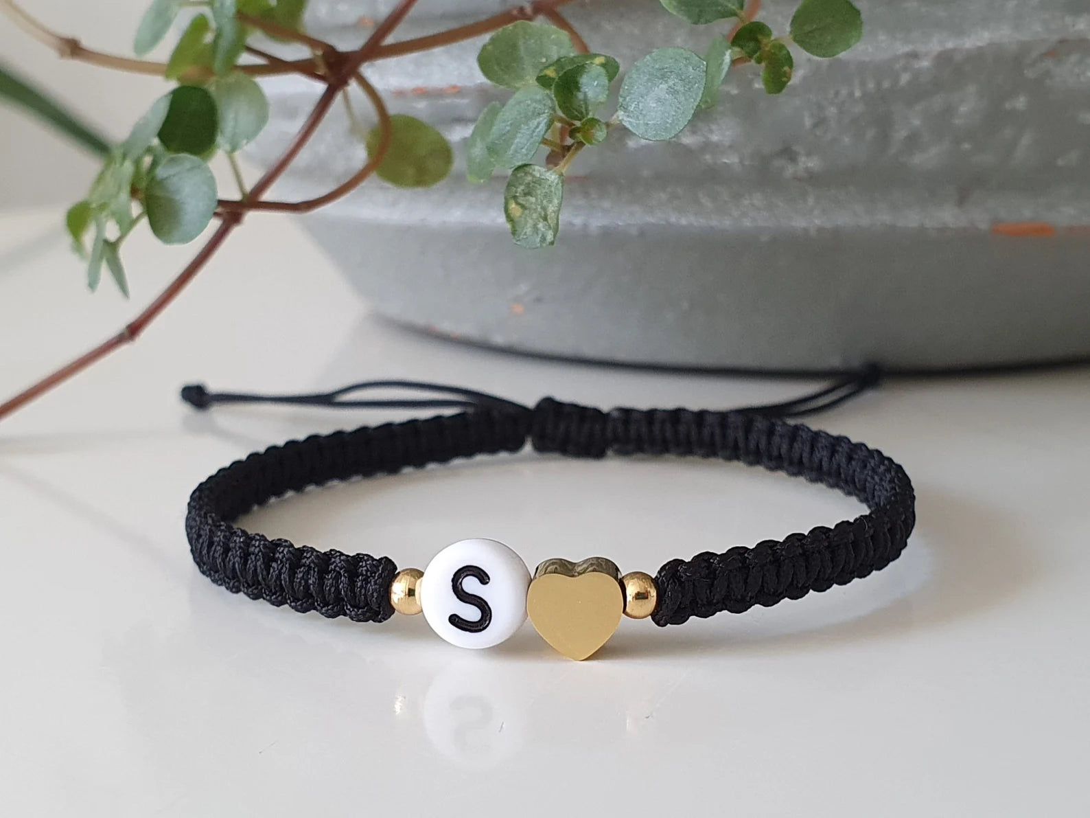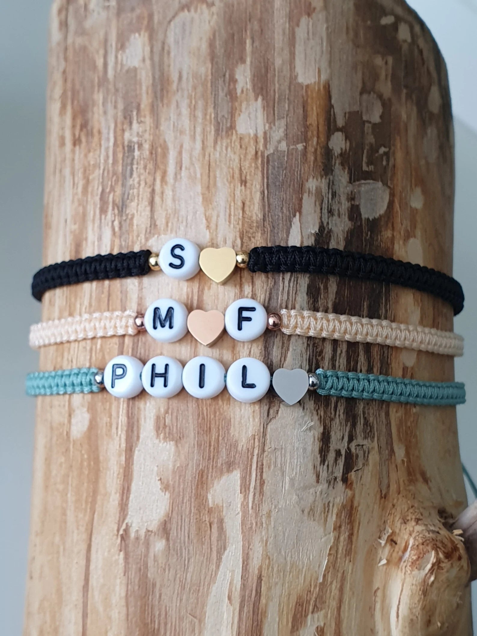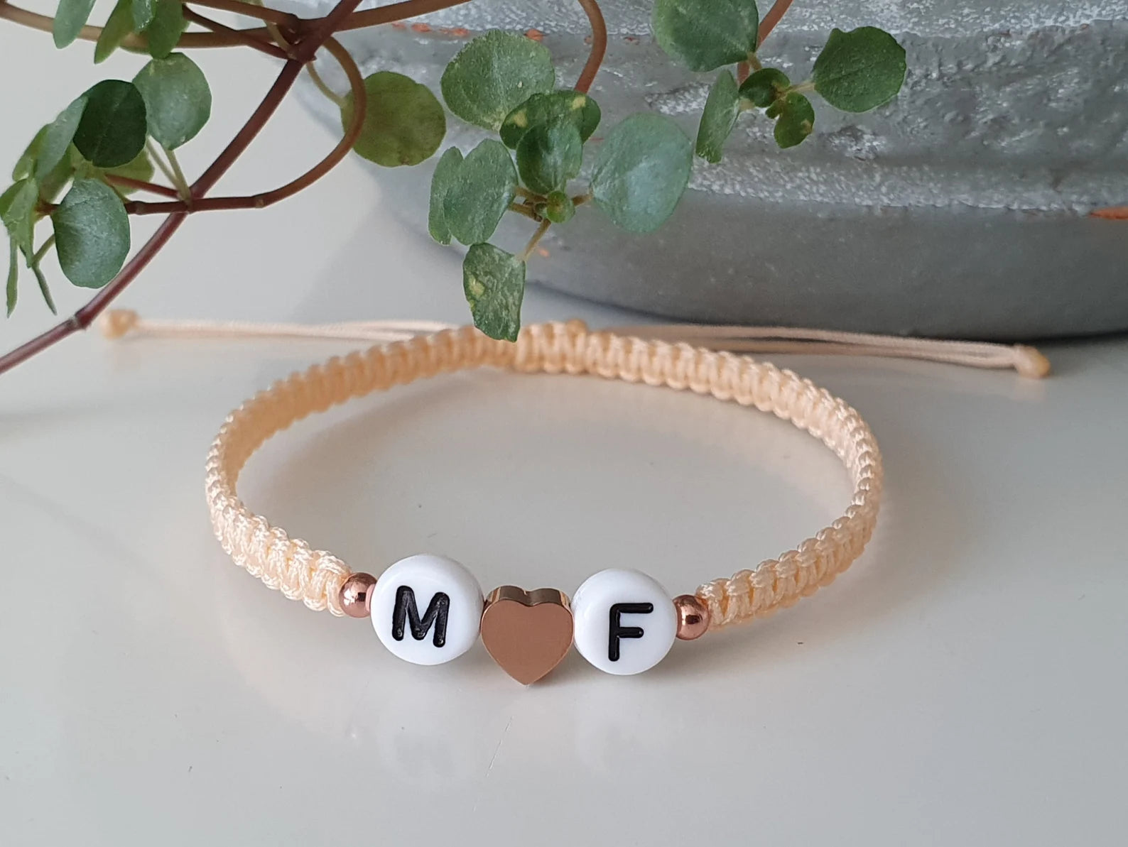 Handgeknüpftes Makramee-Armband mit Edelstahl-Perlen und Herz - personalisiert mit deinen Initialen.