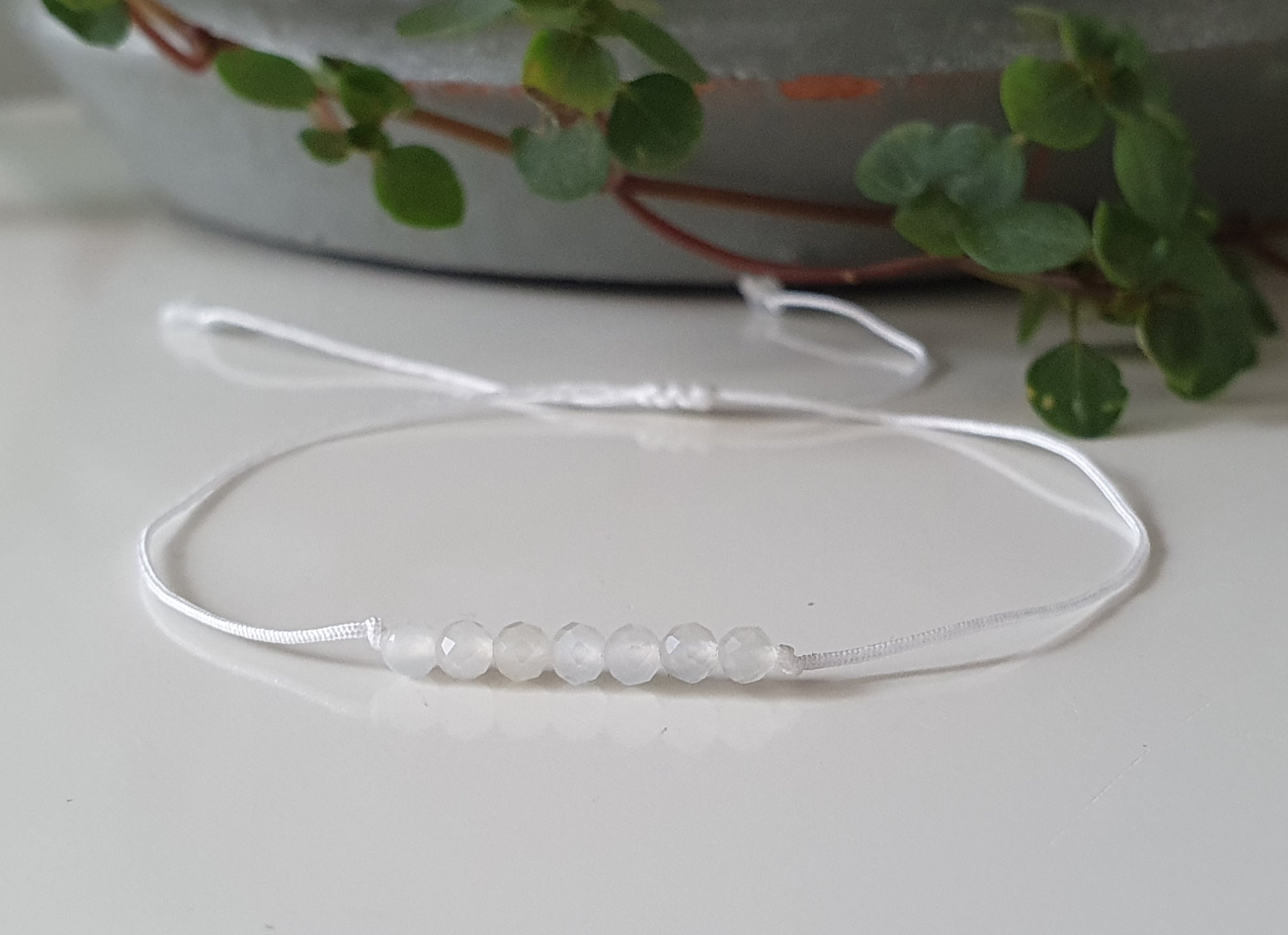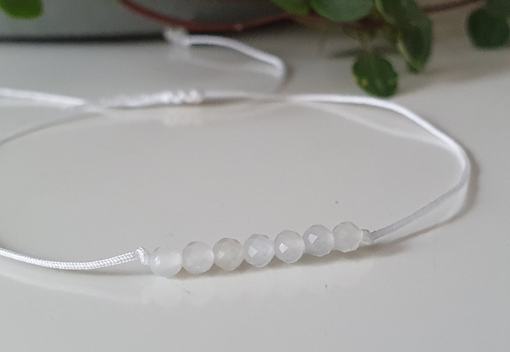 Dieses minimalistische Edelsteinarmband mit Moonstone-Perlen ist filigran, federleicht und kaum spürbar am Handgelenk. Die kleinen Edelsteine verleihen dem Armband einen dezenten Schimmer, der jeden Look abrundet. Durch die Schiebeknotentechnik passt es sich flexibel fast jeder Handgelenkgröße an – praktisch und elegant zugleich.