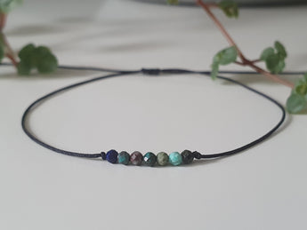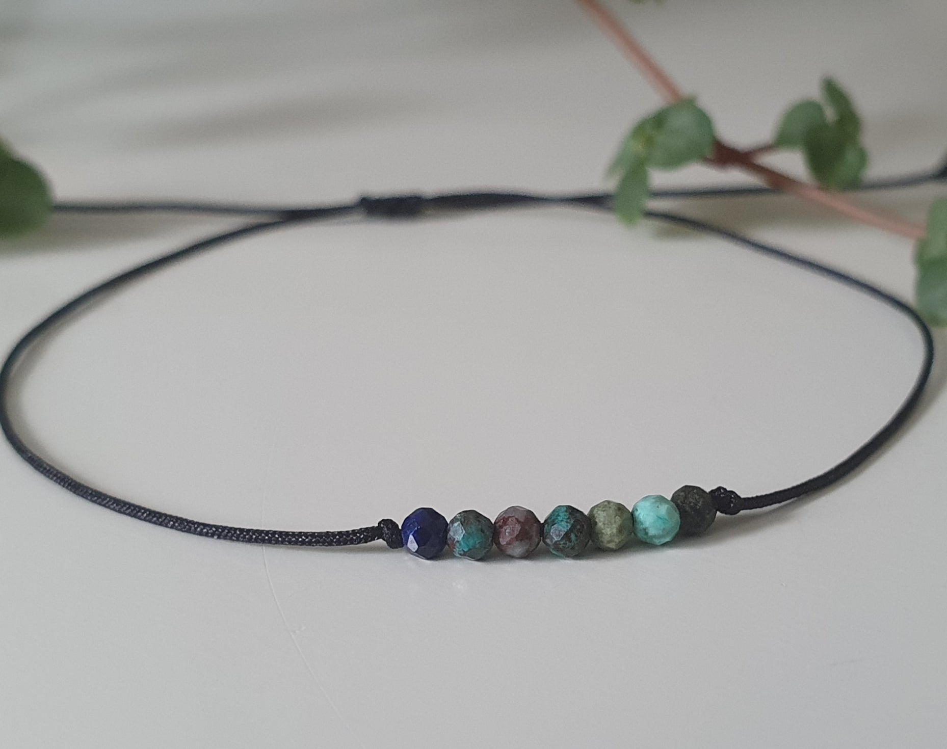 Dieses zarte Edelsteinarmband mit Chrysokoll-Perlen vereint Minimalismus mit der wohltuenden Wirkung eines besonderen Heilsteins. Die kleinen, echten Perlen liegen federleicht und kaum spürbar am Handgelenk. Durch die Schiebeknotentechnik passt sich das Armband flexibel fast jeder Handgelenkgröße an – bequem, filigran und stilvoll.